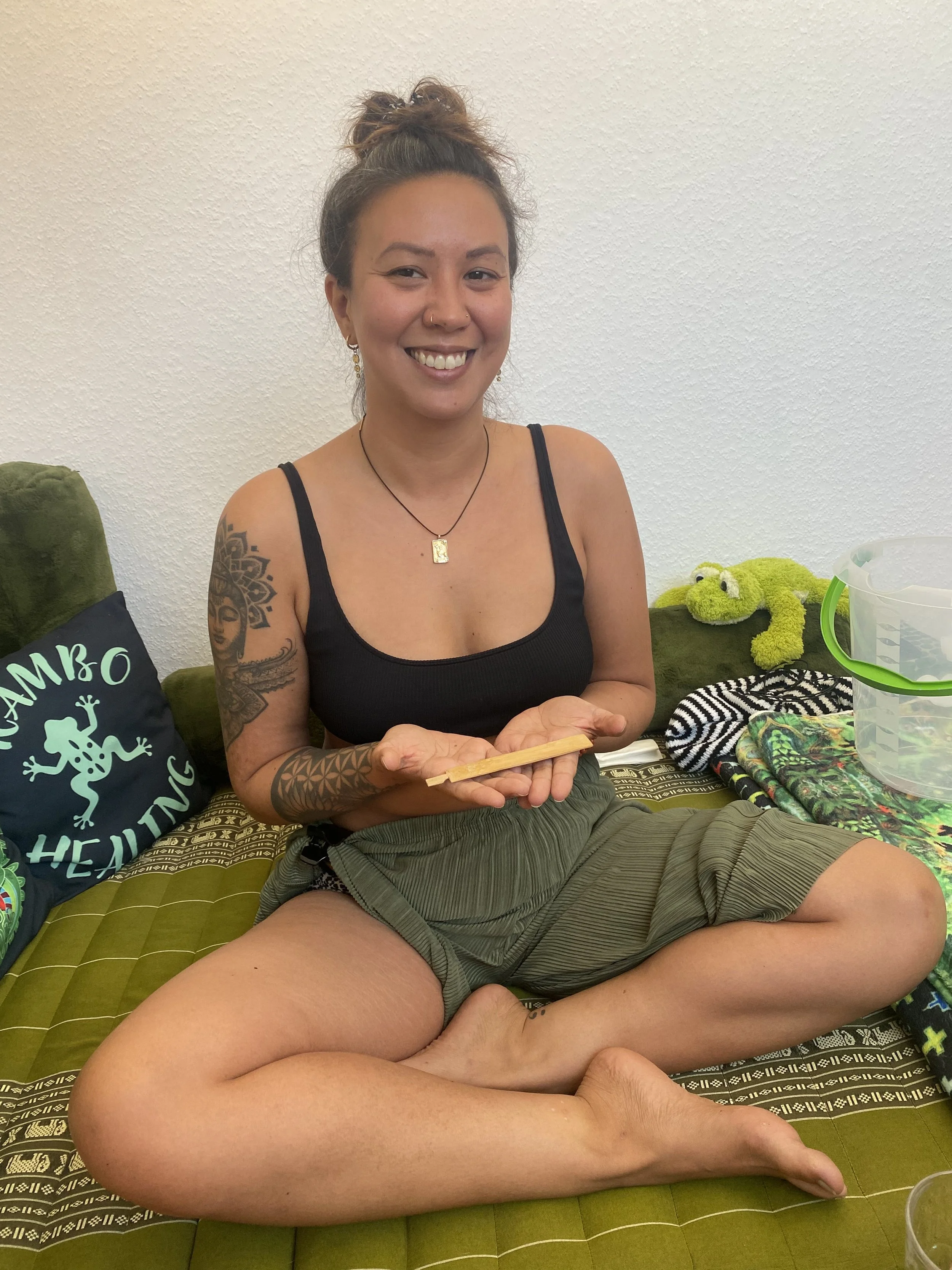 Meine Erfahrungen mit Kambo behalte ich lieber für mich, denn ich möchte die Reise anderer nicht beeinflussen. Denn genau das ist es - eine zutiefst persönliche Erfahrung. Was ich sagen kann und will, ist, dass es für mich eine unglaublich wichtige Erfahrung war, die ich unbedingt wiederholen möchte, auch wenn die Sitzung selbst nicht gerade angenehm ist. Aber ich habe gleich danach gespürt, wie wertvoll dieser Prozess war und wie er sich weiter in mein Leben integrieren wird. Ich bin so unglaublich dankbar dafür und freue mich auf die nächste 🐸 Reise."- Lorena