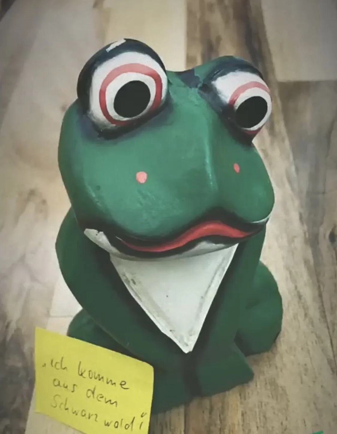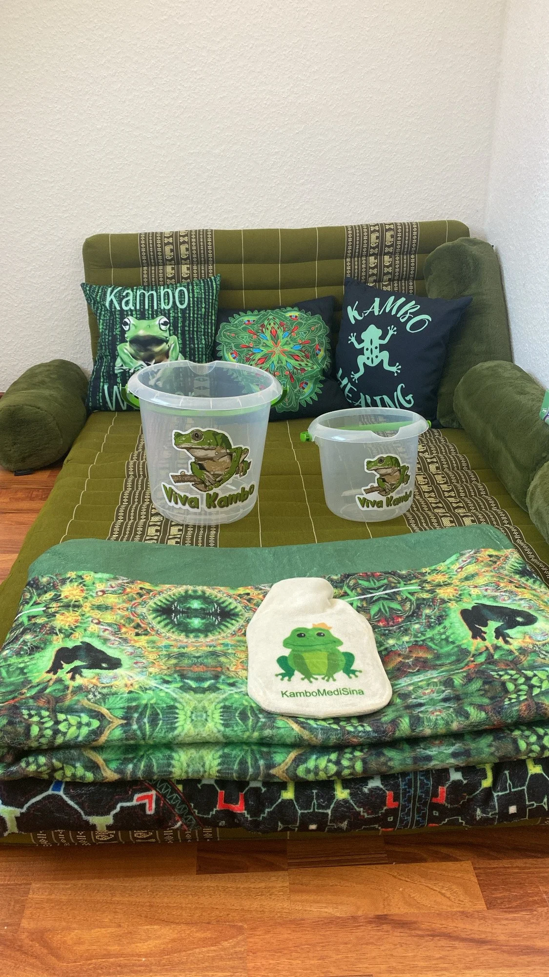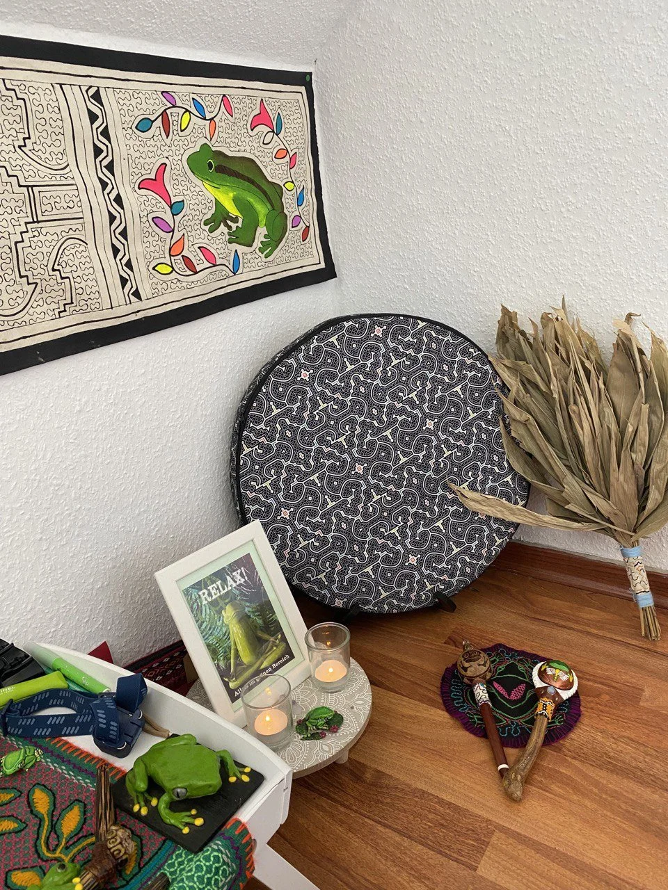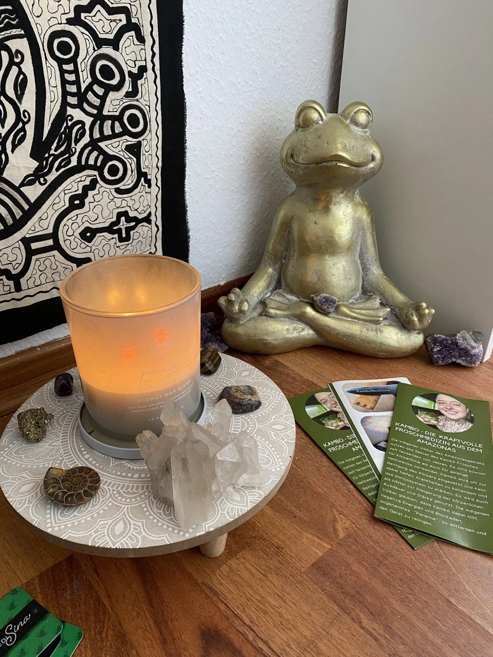 Am Tag vor meiner ersten Zeremonie stolperte ich über einen grünen Holzfrosch, der vor ihrem Haus auf mich wartete, als wir in die Stadt gehen wollten. Ich hatte oft davon gehört, dass Frösche auf viele verschiedene Arten auftauchen, wenn der Ruf nach Kambô lauter wird und dieser zeigte es ganz deutlich! Zuerst war ich mir nicht sicher, ob ich ihn mitnehmen konnte, aber meine Freundin erzählte mir, dass die Leute immer Dinge, die sie nicht mehr wollen, vor ihren Häusern liegen lassen, damit andere sie mitnehmen können. Ich habe mir gesagt: "Wenn er noch da ist, wenn wir später zurückkommen, dann weiß ich ganz sicher, dass er für mich bestimmt ist", und natürlich war er noch da, als wir zurückkamen, also habe ich ihn aufgehoben und er trug eine kleine Botschaft in Form eines Zettels unter sich mit der Aufschrift "Hallo, ich komme aus dem Schwarzwald". Heute ist er ein fester Bestandteil meines Altars und begleitet nicht nur mich, sondern auch meine Klienten durch ihre persönlichen Prozesse in den Kambo Behandlungen.
